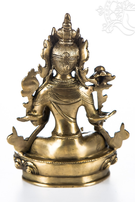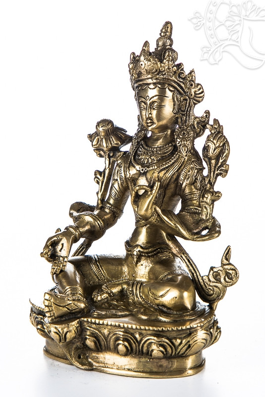 Rézből készült Zöld Tara szobor, matt sárga színű. Magassága 21 cm, súlya 1,80 kg.Zöld Tara: