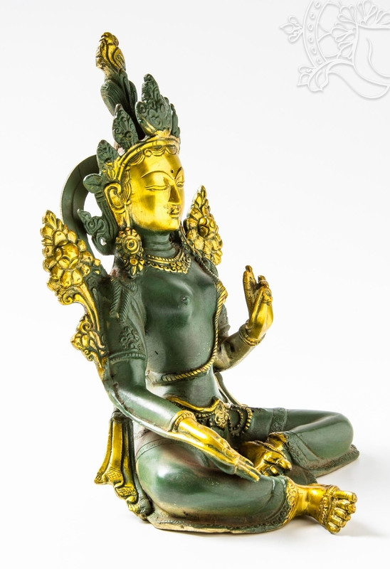 Rézből készült Zöld Tara szobor, zöld - arany színű. Magassága 27 cm, súlya kb. 3 kg. Zöld Tara: